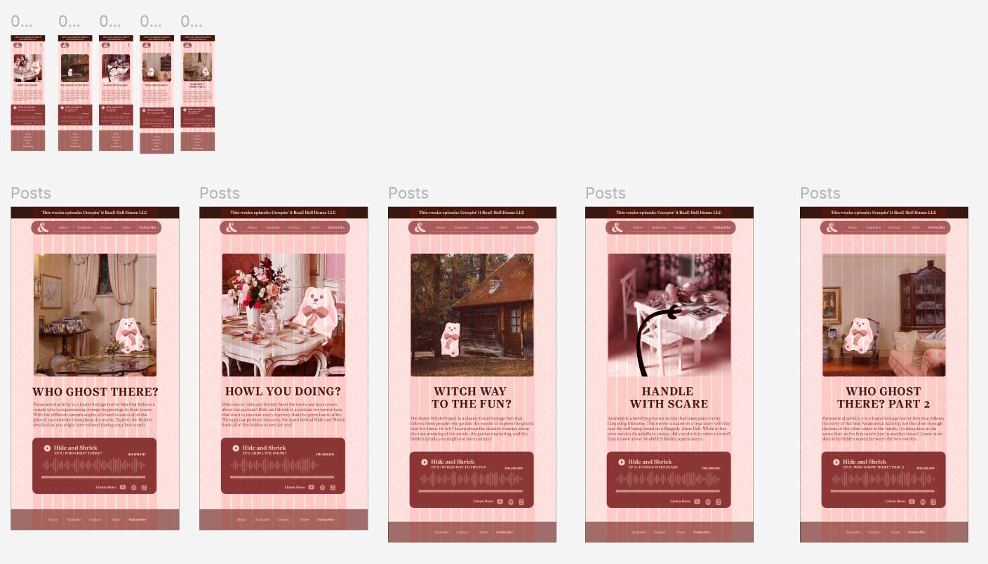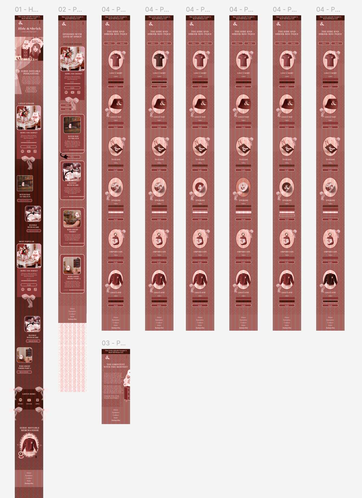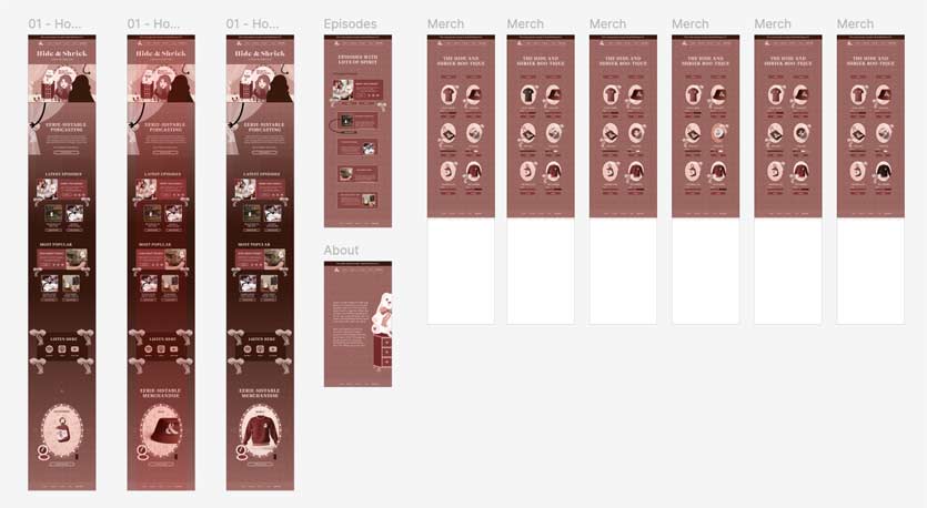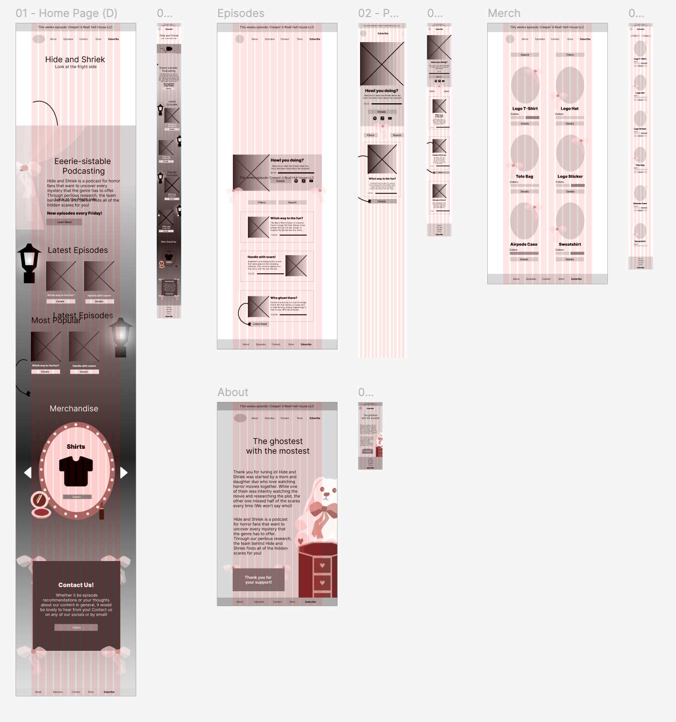 The prototypes for the desktop versions utilized the same textures from the original video, as well as they were all linked together. The most challenging part to linking the website was the store, since there are several variations of some products, but it was important to showcase them. One important element of the prototype design was how the colors would be applied across each page. I wanted to use the darker colors as the background in order to emphasize the eerie vibe of the podcast. I used gradients to transition from the about section to the episode section, so that I could use some of the mid-toned colors. The initial design incorporated zig zag layouts in different elements, such as the episodes. Overall, I was satisfied with the overall layout and design across the pages!